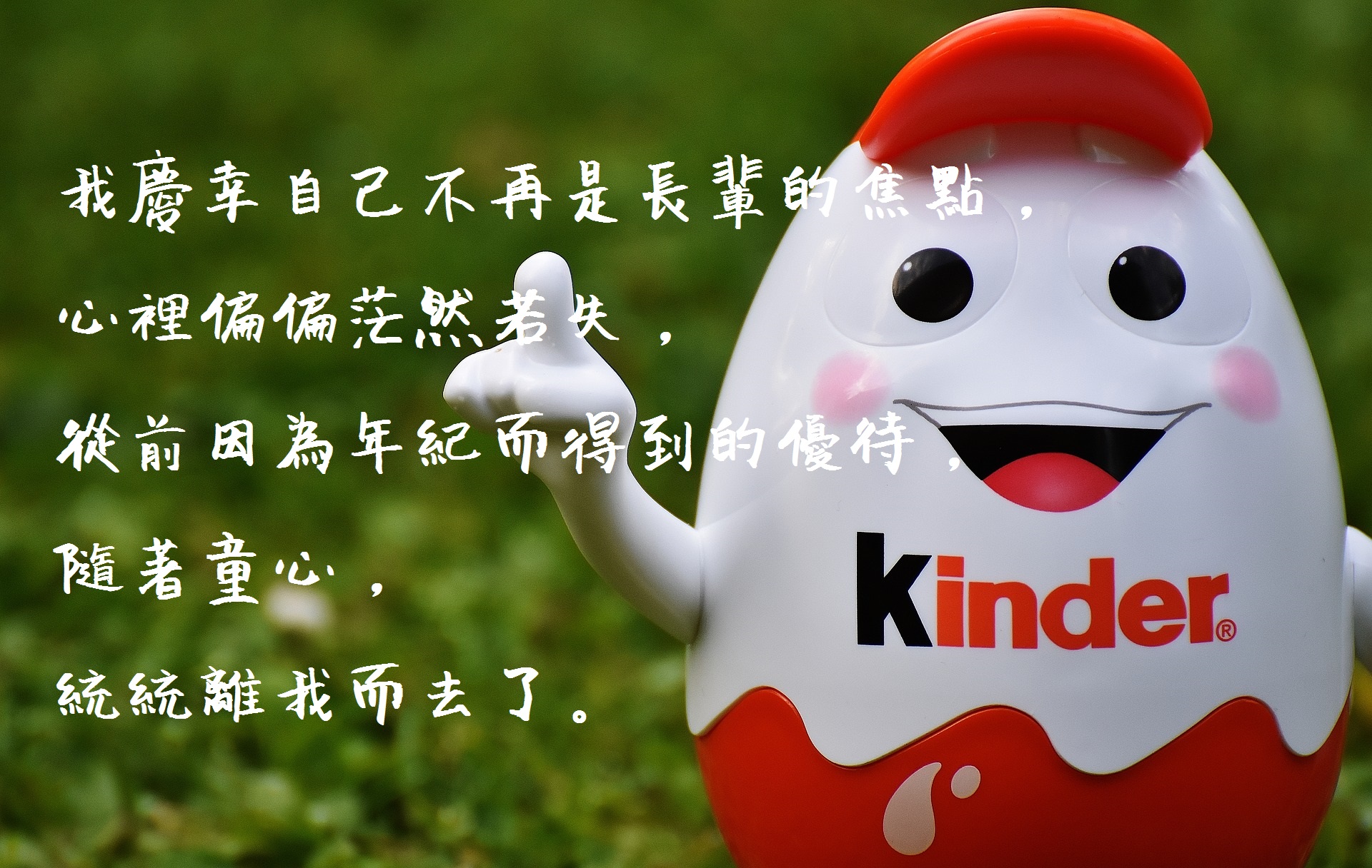 我慶幸自己不再是長輩的焦點,心裡偏偏茫然若失,從前因為年紀而得到的優待,隨著童心,統統離我而去了。