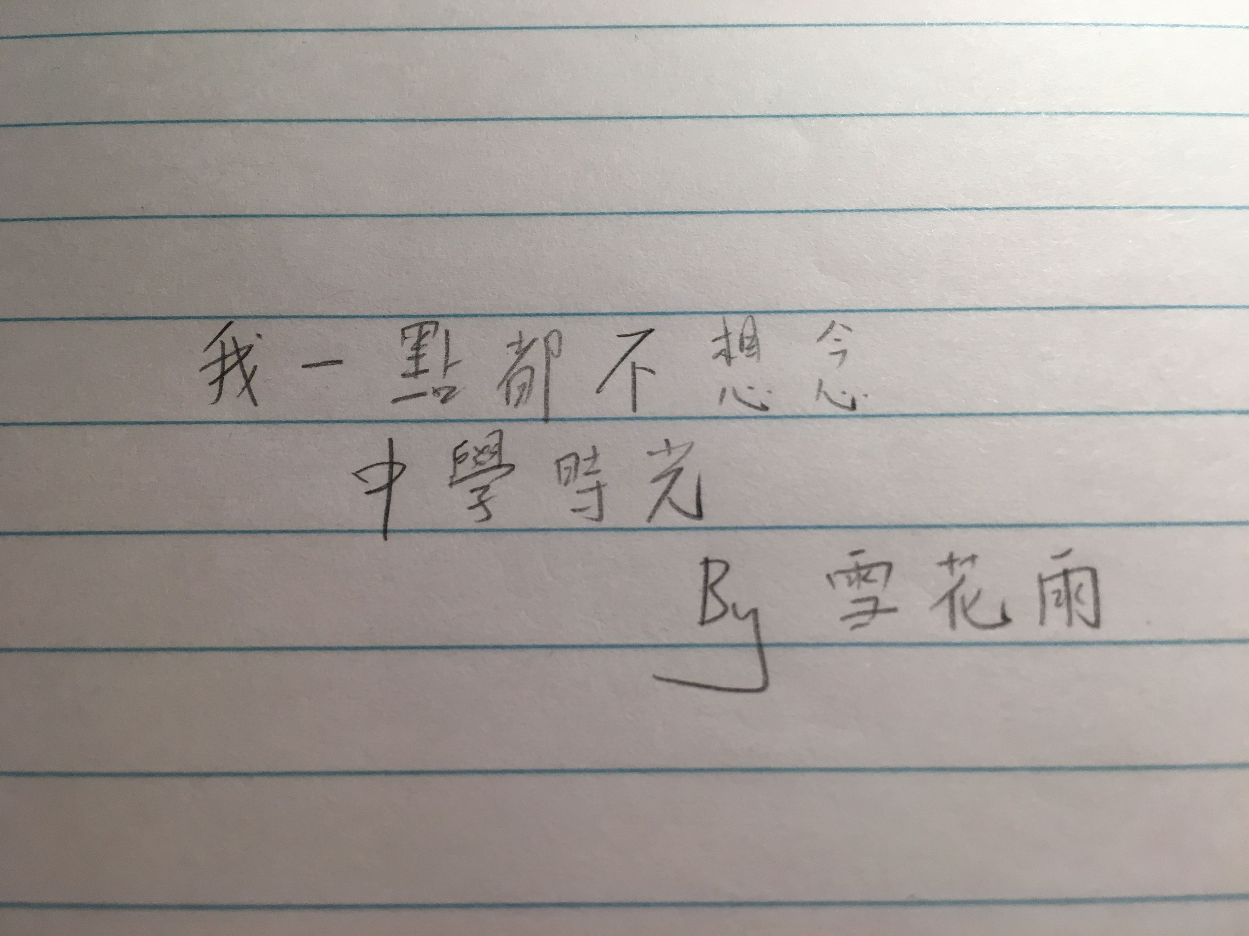中學嘛,儘管有討厭的東西,討厭的老師,討厭的同學。可是,三年過去了,我卻想念當時上堂的時光,想念當時上堂的吵鬧,想念當時的八卦是非,想念當時的學會活動…說白了,其實我還是想念中學的嘛。雖然嘴巴說著不想念這些日子。